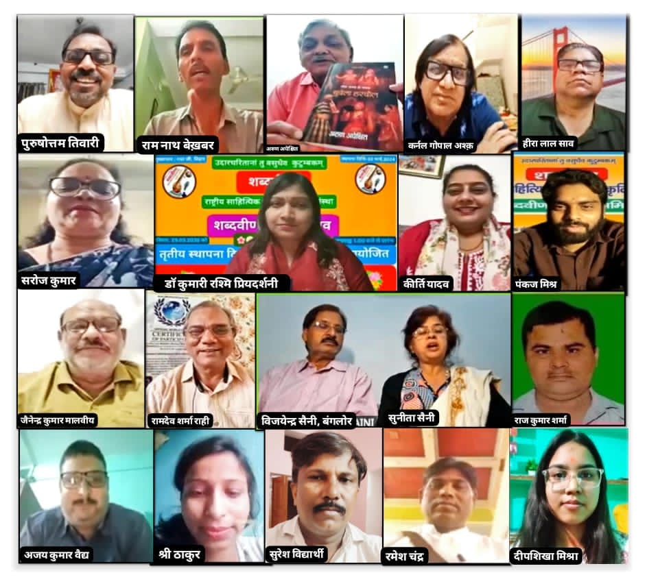 कार्यक्रम में पश्चिम बंगाल से प्रदेश अध्यक्ष राम नाथ बेख़बर, प्रदेश उपाध्यक्ष हीरा लाल साव, एवं राष्ट्रीय परामर्शदाता एवं पश्चिम बंगाल प्रदेश संरक्षक पुरुषोत्तम तिवारी, बिहार से गया जिला अध्यक्ष जैनेन्द्र कुमार मालवीय, डॉ रश्मि प्रियदर्शनी, राष्ट्रीय उप संगठन मंत्री पंकज मिश्र, राष्ट्रीय प्रवक्ता सुरेश विद्यार्थी, एवं युवा कवयित्री दीपशिखा मिश्रा, कर्नाटक से प्रदेश अध्यक्ष सुनीता सैनी गुड्डी एवं प्रदेश उपाध्यक्ष विजयेन्द्र सैनी, झारखंड से कवयित्री शालिनी नागर एवं श्री ठाकुर, मध्य प्रदेश से प्रदेश सचिव अरुण अपेक्षित एवं प्रदेश संगठन मंत्री कर्नल गोपाल अश्क़, उत्तर प्रदेश से मथुरा जिला अध्यक्ष राम देव शर्मा राही, उत्तर प्रदेश सचिव राज कुमार शर्मा एवं प्रवक्ता रमेश कुमार, हरियाणा से प्रदेश सचिव सरोज कुमार एवं कीर्ति यादव की गरिमामय उपस्थिति रही। रचनाकारों ने विविध विषयों पर एक से बढ़कर एक गीत, ग़ज़ल, छंद, मुक्तक और दोहे पढ़े। राम नाथ बेख़बर की “मैं हमेशा जिंदगी की धार से लड़ता रहा” एवं “कहीं बोलना है कहीं बोलते हैं, जहाँ बोलना है, नहीं बोलते हैं” जैसी ग़ज़लों पर खूब वाहवाहियाँ लगीं। कार्यक्रम अध्यक्ष अरुण अपेक्षित एवं मुख्य अतिथि पुरुषोत्तम तिवारी ने सभी को शब्दवीणा के तृतीय स्थापना दिवस की हार्दिक बधाइयाँ दीं। सभी ने शब्दवीणा परिवार के उज्ज्वल भविष्य की कामना की। कार्यक्रम का सीधा प्रसारण शब्दवीणा केन्द्रीय पेज से हुआ, जिससे जुड़कर महावीर सिंह वीर, पी.के.मोहन, डॉ वीरेन्द्र कुमार, डॉ शिव प्रकाश दास, अशोक राय वत्स, सुनील कुमार उपाध्याय, डॉ रवि प्रकाश, डॉ विजय शंकर, विनोद बरबिगहिया आदि अनेक साहित्यानुरागियों ने अपनी टिप्पणियों से प्रतिभागियों का उत्साहवर्द्धन किया। कार्यक्रम का समापन पावन शांति पाठ से हुआ।