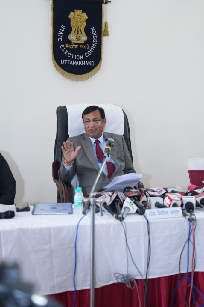 राज्य निर्वाचन आयुक्त श्री सुशील कुमार ने शनिवार को राज्य निर्वाचन आयोग के सभाकक्ष में आयोजित प्रेस वार्ता में राज्य के 12 जनपदों (जनपद हरिद्वार को छोड़कर) में त्रिस्तरीय पंचायतों के सामान्य निर्वाचन को लेकर तय कार्यक्रम एवं आयोग की तैयारियों की जानकारी दी। इस मौके पर आयोग के सचिव राहुल कुमार गोयल और संयुक्त सचिव कमलेश मेहता भी उपस्थित रहे।