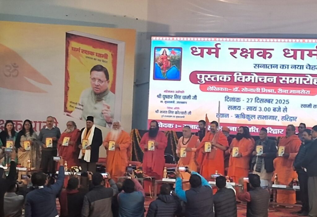 हरिद्वार। राष्ट्र संचालन के लिए धर्म नीति का होना आवश्यक है, धर्म की रक्षा होगी तभी राष्ट्र सुरक्षित रहेगा। राष्ट्र-राज्य की सुरक्षा को चुनौती दे रही जिहादी मानसिकता को समाप्त करने में जिस तरह मुख्यमंत्री पुष्कर सिंह धामी ने ताबड़ तोड़ कार्यवाही की है, उसे डॉ. सोनाली मिश्रा व रीना मानसेरा ने लिपिबद्ध कर सहरानीय कार्य किया है। यह उद्गगार सनातन सद्भावना समिति द्वारा आयोजित कार्यक्रम में जगतगुरु शंकराचार्य स्वामी राजराजेश्वराश्रम महाराज ने धर्म रक्षक धामी पुस्तक के विमोचन अवसर पर ऋषिकुल सभागार में दिए।