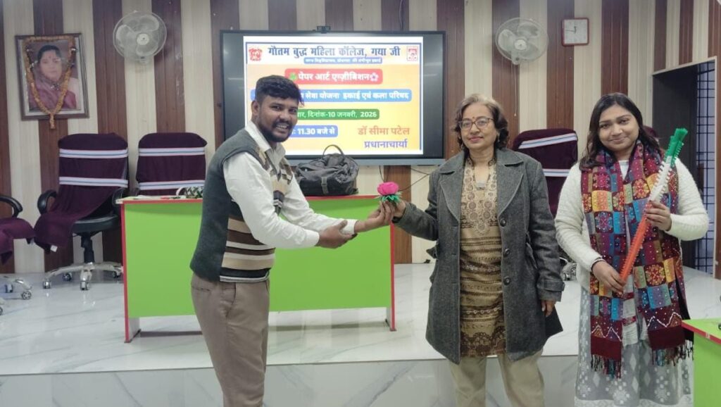 गया जी। गौतम बुद्ध महिला कॉलेज में राष्ट्रीय सेवा योजना इकाई एवं कला परिषद के संयुक्त तत्त्वावधान में “पेपर आर्ट एग्ज़ीबिशन” का आयोजन किया गया। प्रधानाचार्या डॉ सीमा पटेल के संरक्षण में एवं एनएसएस कार्यक्रम पदाधिकारी डॉ कुमारी रश्मि प्रियदर्शनी के संयोजन में आयोजित ओरीगेमी पर आधारित इस कला प्रदर्शनी में महात्मा गाँधी ट्रेनिंग इंस्टीट्यूट सब्जेक्ट अॉफ स्कूल एंड कॉलेज, वेस्ट पेपर रिसाइक्लिंग मैनेजमेंट, नई दिल्ली की ओर से आये कलाकार राहुल लाल ने छात्राओं को वेस्ट पेपर से तरह-तरह के सुंदर पेपर डिजाइन्स बनाने सिखलाये। उन्होंने छात्राओं को बड़े ही रोचक अंदाज में रंग-बिरंगे कागजों से कैंडल स्टैंड, कबूतर, गुलाब का फूल, सरू का पेड़, रंगोली, कमल का फूल, मीनाक्षी टेंपल, कुतुबमीनार, मालाएँ, लैंप शेड आदि बनाया सिखलाया। राहुल लाल ने प्रधानाचार्या डॉ सीमा पटेल, डॉ रश्मि, एनएसएस स्वयंसेवकों, एनसीसी कैडेटों एवं विभिन्न विभागों की छात्राओं को पेपर से बने फूल और गुलदस्ते देकर सम्मानित किया।