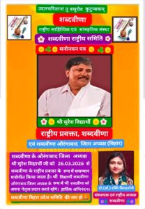 गया जी। राष्ट्रीय साहित्यिक एवं सांस्कृतिक संस्था शब्दवीणा की औरंगाबाद जिला इकाई के अध्यक्ष, पत्रकार एवं साहित्यसेवी सुरेश विद्यार्थी को शब्दवीणा का राष्ट्रीय प्रवक्ता मनोनीत किया गया है। शब्दवीणा की संस्थापिका एवं राष्ट्रीय अध्यक्ष प्रो. (डॉ.) रश्मि प्रियदर्शनी ने इस संबंध में शब्दवीणा का मनोनयन पत्र साझा करते हुए बतलाया कि सुरेश विद्यार्थी को राष्ट्रीय प्रवक्ता बनाए जाने का निर्णय उनकी शब्दवीणा के उज्ज्वल भविष्य के लिए योजनाबद्ध निष्ठा, नेतृत्व क्षमता, उत्साह, समर्पण भाव, विनम्रता, एवं सक्रियता को देखते हुए लिया गया है। डॉ रश्मि ने बतलाया कि राष्ट्रीय प्रवक्ता के रूप में श्री विद्यार्थी का योगदान अब महज शब्दवीणा की औरंगाबाद जिला समिति को ही नहीं, अपितु पूरी संस्था को प्राप्त हो सकेगा। शब्दवीणा की गतिविधियों के प्रचार-प्रसार में वृद्धि के साथ संगठनात्मक शक्ति भी सुदृढ़ होगी। सुरेश विद्यार्थी को राष्ट्रीय प्रवक्ता बनाए जाने पर साहित्य जगत, विशेष रूप से शब्दवीणा की औरंगाबाद जिला समिति के पदाधिकारियों एवं सदस्यों में प्रसन्नता की लहर है। वहीं सुरेश विद्यार्थी ने राष्ट्रीय प्रवक्ता के सम्मानजनक पद पर मनोनीत किए जाने के लिए राष्ट्रीय अध्यक्ष सहित समस्त शब्दवीणा परिवार के प्रति आभार जताया है। उन्होंने बड़े ही हर्ष के साथ कहा कि आगामी 30 मार्च को शब्दवीणा के तीसरे स्थापना दिवस समारोह के तहत शब्दवीणा की औरंगाबाद जिला समिति के संयोजन में औरंगाबाद में “कवि सम्मेलन सह सम्मान समारोह” का आयोजन किया जाएगा।