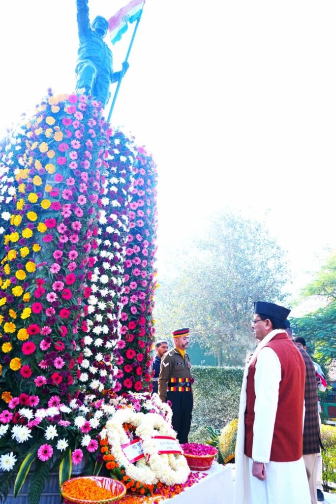 मुख्यमंत्री श्री पुष्कर सिंह धामी ने मंगलवार को विजय दिवस के अवसर पर गांधी पार्क, देहरादून में आयोजित श्रद्धांजलि एवं सम्मान समारोह कार्यक्रम में प्रतिभाग करते हुए शहीद स्मारक पर पुष्पचक्र अर्पित कर वीर बलिदानियों को श्रद्धांजलि दी। इस अवसर पर उन्होंने 1971 के युद्ध के सैनिकों और शहीदों के परिजनों को सम्मानित भी किया। कार्यक्रम में मुख्यमंत्री ने घोषणा की कि सैनिक कल्याण निदेशालय और जिला सैनिक कल्याण कार्यालय (डीडीहाट, हरबर्टपुर, पिथौरागढ़ एवं हरिद्वार) इन सभी पाँच कार्यालयों में सरकारी वाहन दिए जाएंगे।