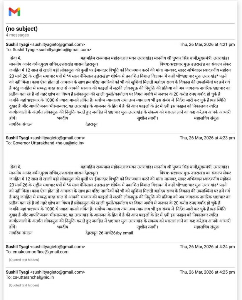 संयुक्त नागरिक संगठन द्वारा प्रदेश के राज्यपाल मुख्यमंत्री मुख्यसचिव को भेज गए ज्ञापन में राज्य के विकास की उपलब्धियां पर गर्व व्यक्त करते हुए कहा गया है की जनहित से सम्बद्ध बारह साल से सरकार की फाइलों में लटकी लोकायुक्त की नियुक्ति की प्रक्रिया को अब जागरूक नागरिक भ्रष्टाचार का प्रतीक बता रहे है। यह गहरे क्षोभ का विषय है।लोकायुक्त की खाली कुर्सी/कार्यालय पर विगत अवधि में जनधन के 20 करोड रुपए बर्बाद हो चुके है जबकि यहां भ्रष्टाचार के 1000 से ज्यादा मामले लंबित हैं। सर्वोच्च न्यायालय तथा उच्च न्यायालय भी इस संबंध में निर्देश जारी कर चुके हैं।यह स्थिति दुखद है और आपत्तिजनक भी। पत्र के आखिर में लिखा गया है की उत्तराखंड के आमजन के हित में है की फाइलों के ढेर में दबी इस फाइल को निकालकर त्वरित कार्यप्रणाली के अंतर्गत लोकायुक्त की नियुक्ति कराते हुए जनहित में भ्रष्टाचार मुक्त उत्तराखंड के संकल्प को धरातल लाने का कष्ट करे।